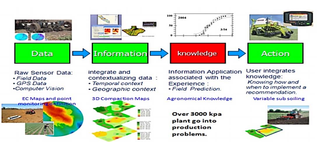 En la figura 1 se observa la utilización de sensores para identificar la zona de terreno más productiva, para así proceder a la preparación de suelo con la información necesaria con respecto a la variabilidad del estudio realizado, además se observa que mediante la ayuda de software e implementos tecnológicos se puede hacer una mejor tratamiento de la información y transfórmala en acciones productivas dentro del sistema agrícola. (Best, Leon, Méndez , Flores, & Aguilera, 2014)